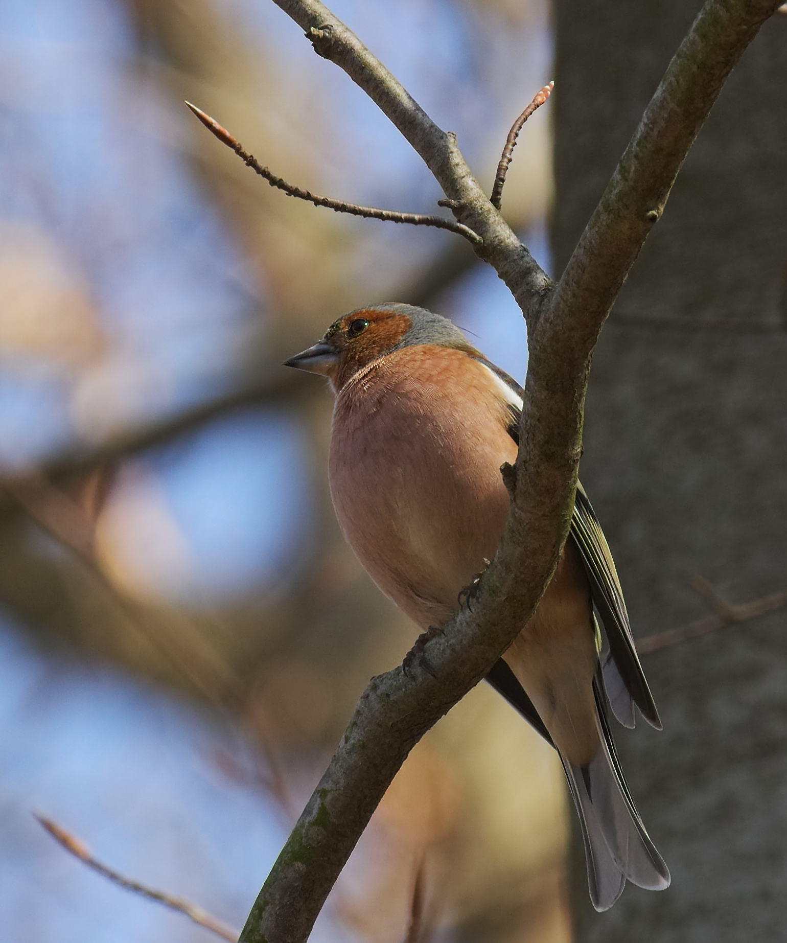 The common chaffinch or simply the chaffinch (Fringilla coelebs) is a common and widespread small passerine bird in the finch family. The male is brightly coloured with a blue-grey cap and rust-red underparts. The female is more subdued in colouring, but both sexes have two contrasting white wing bars and white sides to the tail. The male bird has a strong voice and sings from exposed perches to attract a mate.