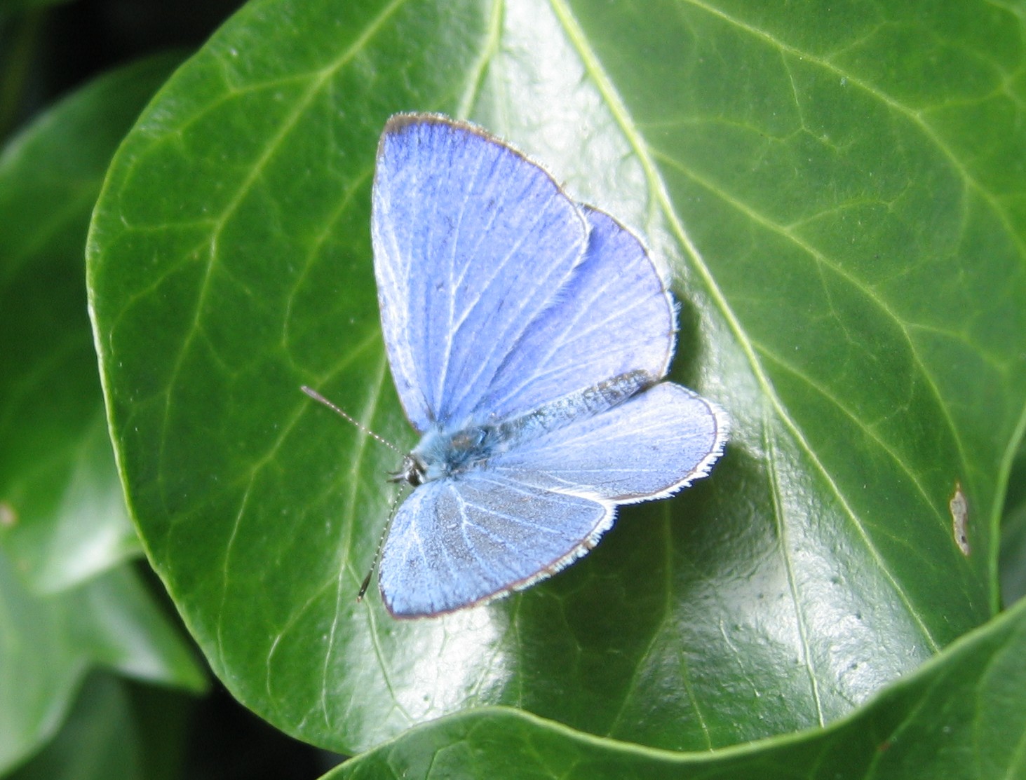 The holly blue has pale silver-blue wings spotted with pale ivory dots. Seitz describes it "Male above shining violet blue, only the apical portion of the costal margin being minutely edged with white. The female has both wings broadly bordered with dark, the margin of the hindwing bearing vestiges of ocelli. Underside silver-white, in the disc a row of black dots, some of which are elongate, and before the margin blackish shadowy dots. Egg very flat, whitish. Larva green or brown, marked with yellowish white, bearing catenulate stripes on the back, on segment 7 a gland to attract ants; head brown. On Ivy, Ilex, Evonymus, Rhamnus, Robinia, Genista, Spartium, Astragalus, Rubus, Erica, Pyrus and many other plants; in Europe visited usually by ants of the genus Lasius; in June and the autumn. Pupa mostly fastened to the underside of a leaf, ochreous with brown spots and markings. The butterflies in the spring and again in July, occasionally a third time at the end of August and in September, everywhere common, particularly at the flowers of ivy and brambles." In Europe, the first generation feeds mainly on the holly species Ilex aquifolium but the second generation uses a range of food plants.The holly blue is the national butterfly of Finland.