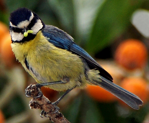 The Eurasian blue tit prefers insects and spiders for its diet. Outside the breeding season, they also eat seeds and other vegetable-based foods. The birds are famed for their acrobatic skills, as they can cling to the outermost branches and hang upside down when looking for food.