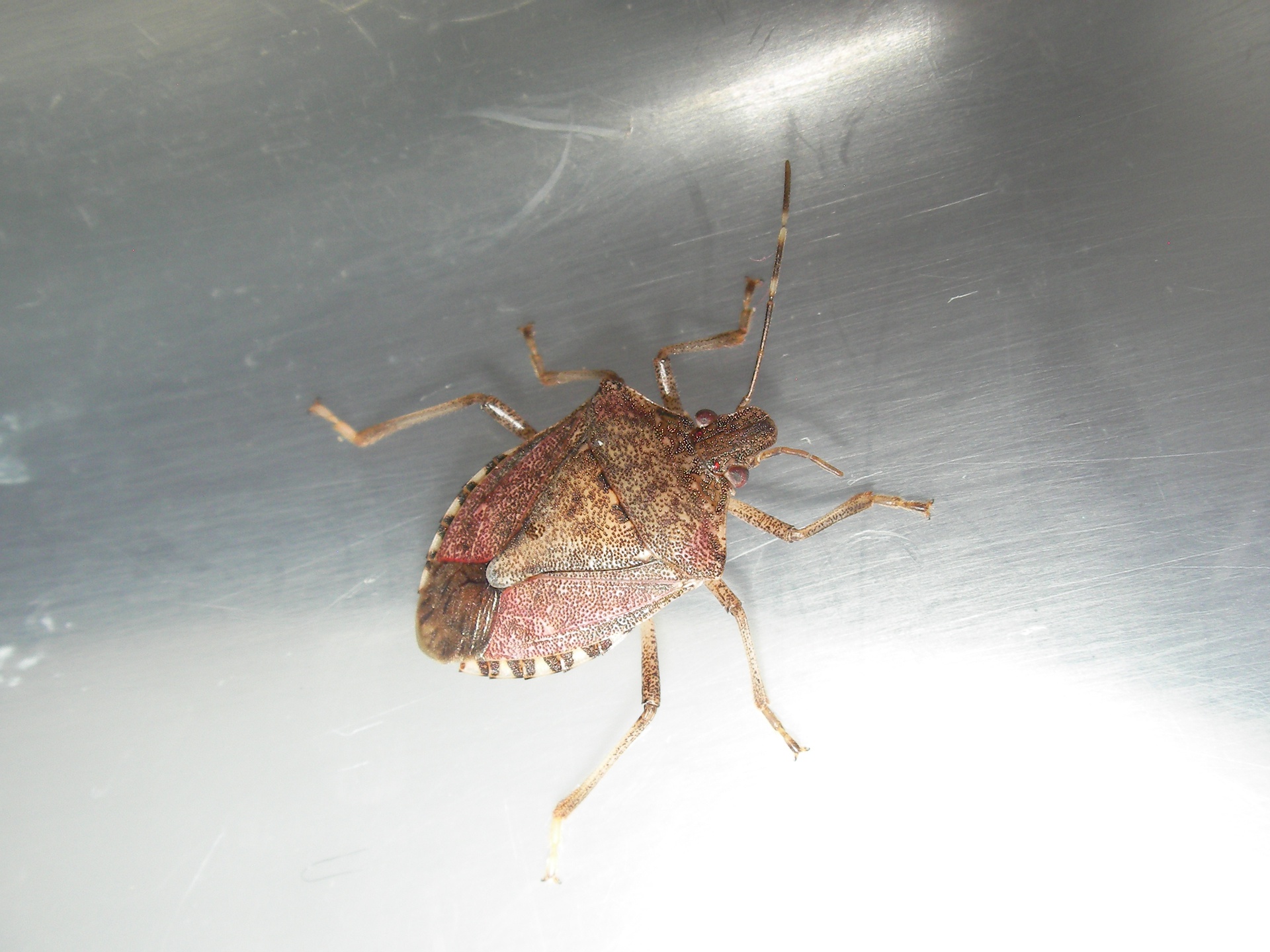 The brown marmorated stink bug (Halyomorpha halys) is an insect in the family Pentatomidae, native to China, Japan, Korea and other Asian regions. In September 1998 it was collected in Allentown, Pennsylvania, where it is believed to have been accidentally introduced. The nymphs and adults of the brown marmorated stink bug feed on over 100 species of plants, including many agricultural crops, and by 2010–11 had become a season-long pest in orchards in the Eastern United States. In 2010, in the Mid-Atlantic United States, $37 million in apple crops were lost, and some stone fruit growers lost more than 90% of their crops. It is now established in many parts of North America, and has recently become established in Europe and South America.