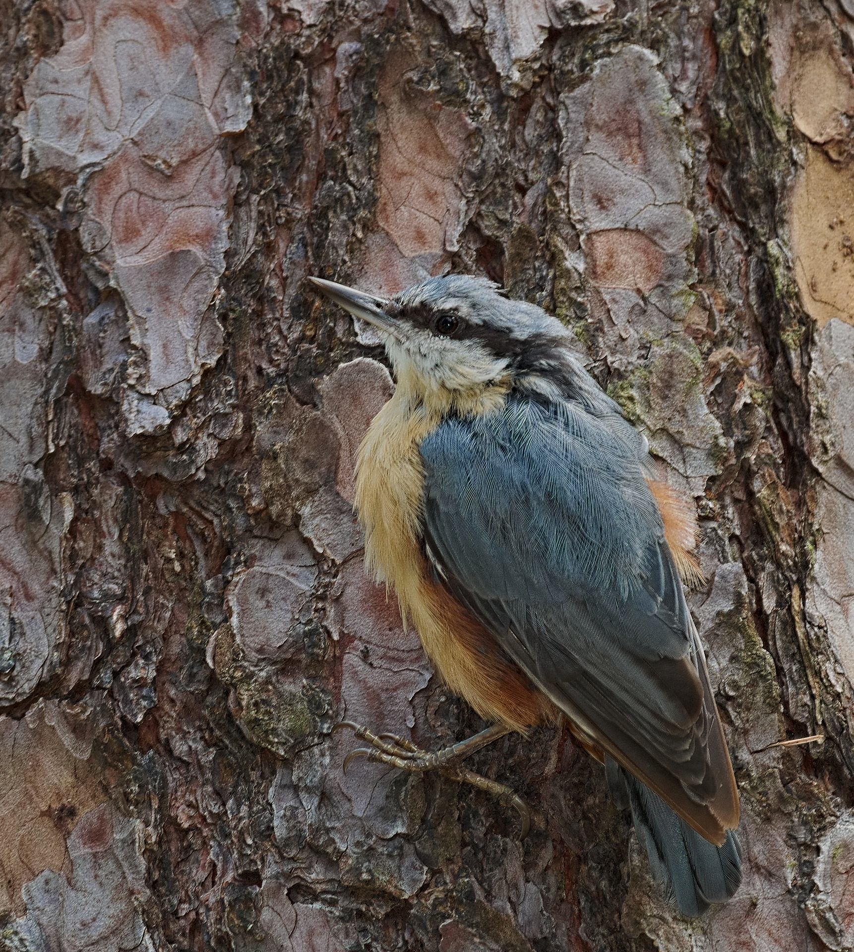 The Eurasian nuthatch or wood nuthatch (Sitta europaea) is a small passerine bird found throughout the Palearctic and in Europe, where its name is the nuthatch. Like other nuthatches, it is a short-tailed bird with a long bill, blue-grey upperparts and a black eye-stripe. It is a vocal bird with a repeated loud dwip call. There are more than 20 subspecies in three main groups; birds in the west of the range have orange-buff underparts and a white throat, those in Russia have whitish underparts, and those in the east have a similar appearance to European birds, but lack the white throat.