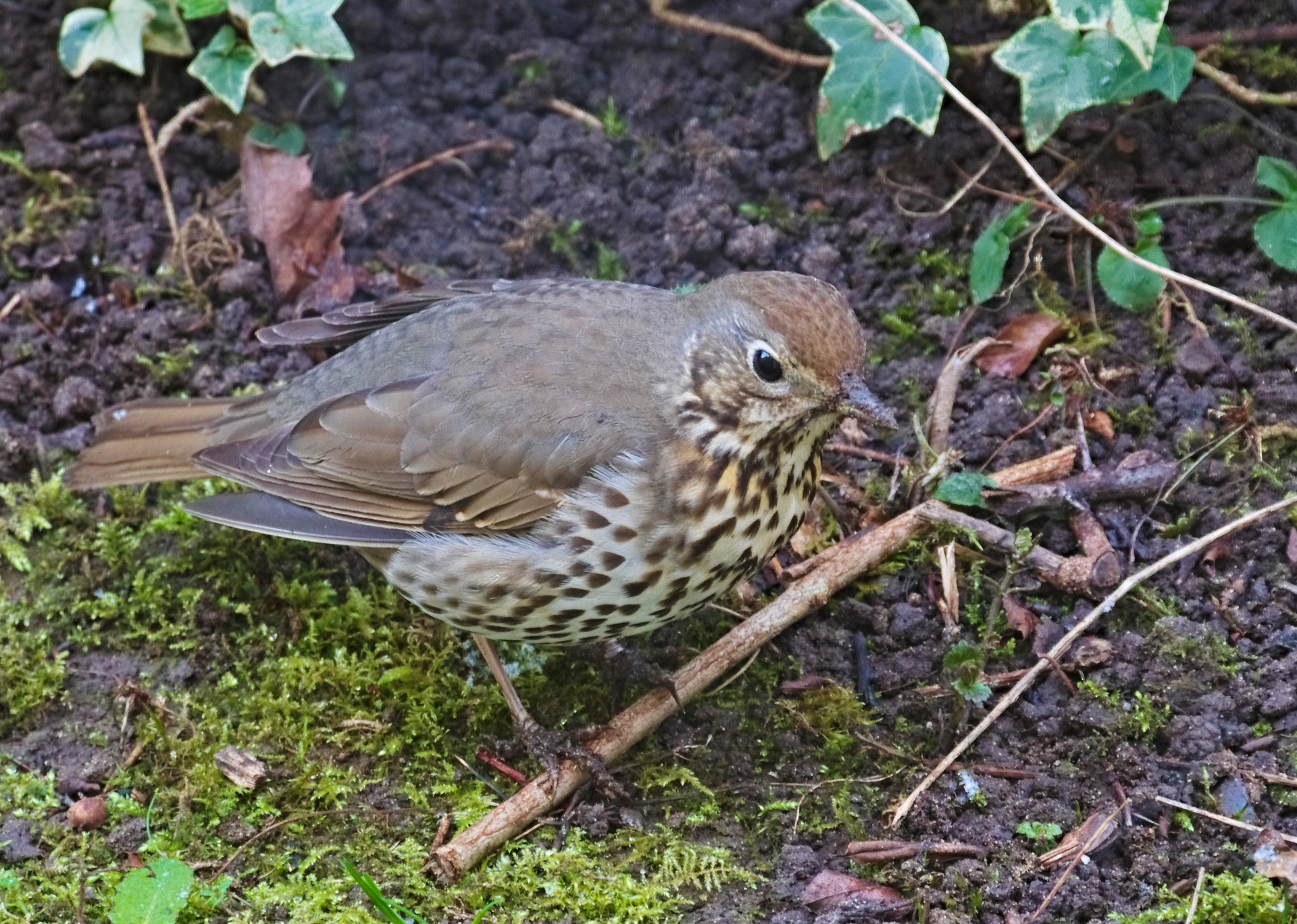 The song thrush (Turdus philomelos) is a thrush that breeds across the West Palearctic. It has brown upper-parts and black-spotted cream or buff underparts and has three recognised subspecies. Its distinctive song, which has repeated musical phrases, has frequently been referred to in poetry.
