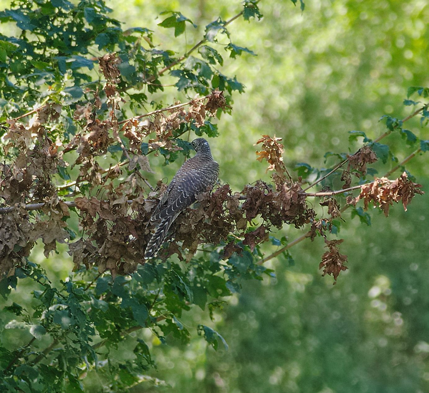 És un una au de cos allargassat amb una longitud total d'uns 35 cm. Les plomes de la gorja i les de les parts superiors són d'un color gris blau, les inferiors són blanquinoses amb ones de color gris fosc, i la cua, llarga, arrodonida, grisenca, tacada de blanc. Ales punxegudes i llargues. Potes grogues. No existeix dimorfisme sexual, però, de vegades, és possible d'observar femelles el disseny de les quals és el mateix que el dels mascles, però amb un to vermellós.