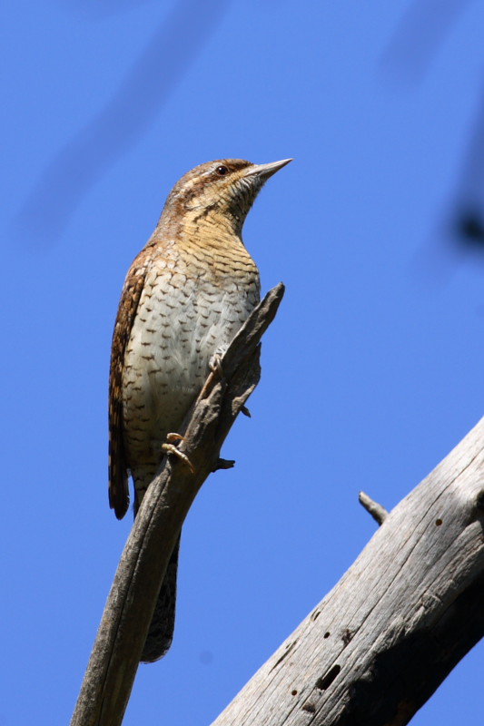 Fa 16 cm de llargària. Té un plomatge de colors apagats, gris i bru amb taques blanques per damunt i ratllat finament per sota. Té la cua llarga i arrodonida el bec curt, recte i punxegut, les potes molt curtes amb dos dits endavant i dos endarrere; la llengua llarga, viscosa i protràctil.