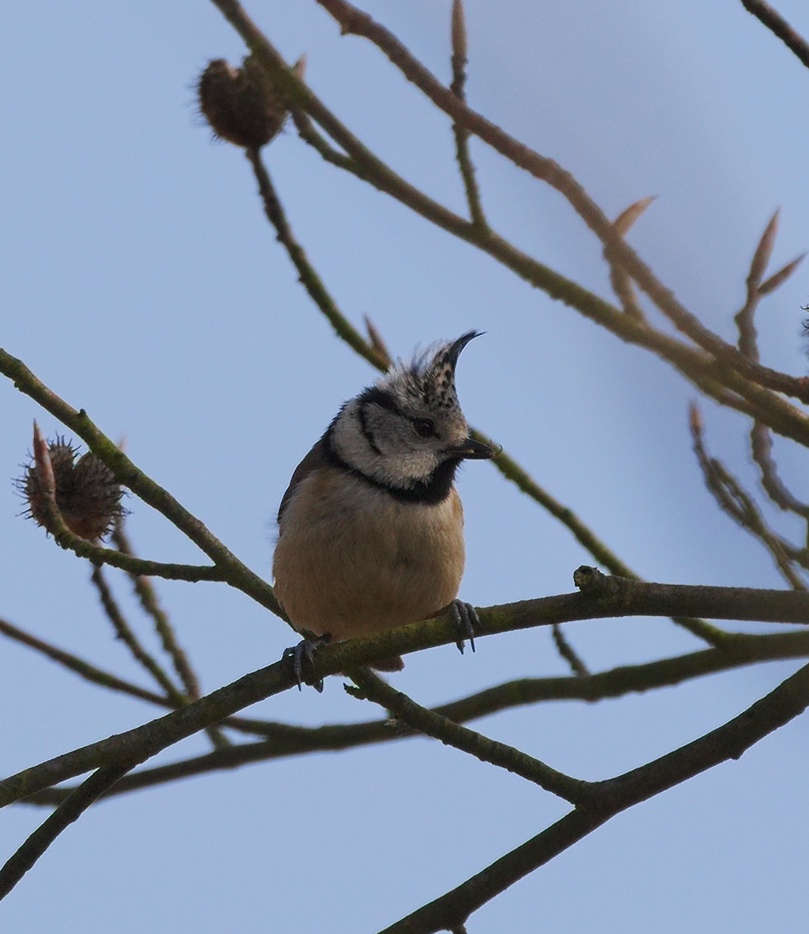 És l'única mallerenga europea que presenta plomall. El plomall del capell és erèctil a voluntat, i l'aixeca quan se sent alarmat, adoptant aleshores una silueta cefàlica punxeguda, molt característica. Les plomes que formen el capell són negres, amb le vores blanques. La nuca és blanca i molt ostensible. El mentó és negre i es perllonga en forma de collar pels laterals del coll. També mostra una llista ocular del mateix color que continua semicircularment i que voreja la cara, blanca. En conjunt forma un disseny molt particular, que el singularitza dels altres moixons. Les parts superiors són brunes grisenques, amb les ales i la cua més fosques. El carpó i les supracaudals són tenyides d'ocraci. Al dessota és blanc, sobretot al pit. Els flancs i l'abdomen són també tenyits d'ocraci. Les cames són blavenques, el bec negre i els ulls rogencs.
