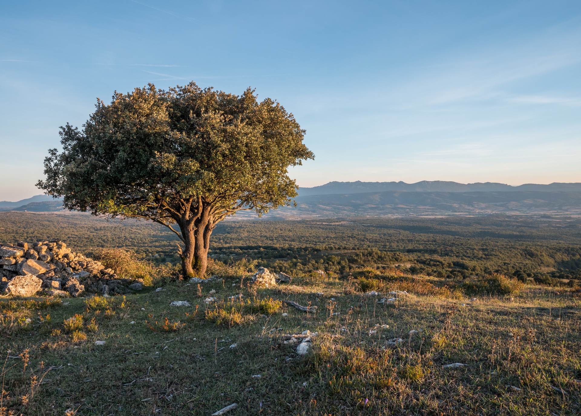 La capçada és ampla i densa, fulles de 3 a 7 cm el·líptiques o oblongues, subenteres (tenen lòbuls) o amb dents poc espinoses (són més espinoses les que estan a prop del terra); de color verd fosc a l'anvers i grisenques i piloses al revers amb de 7 a 11 parells de nervis laterals.